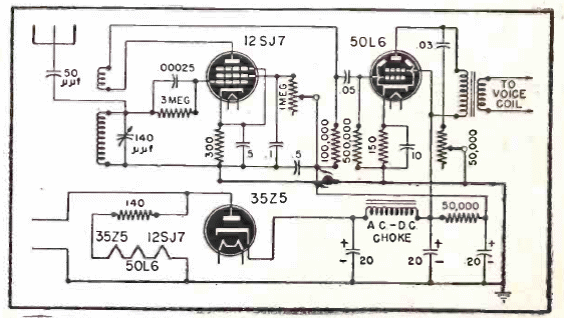 Este circuito de 3 válvulas se encuentra en documentación de 1945. Es un circuito regenerativo para el rango de onda media, alimentado directamente por la red eléctrica con una fuente sin transformador.