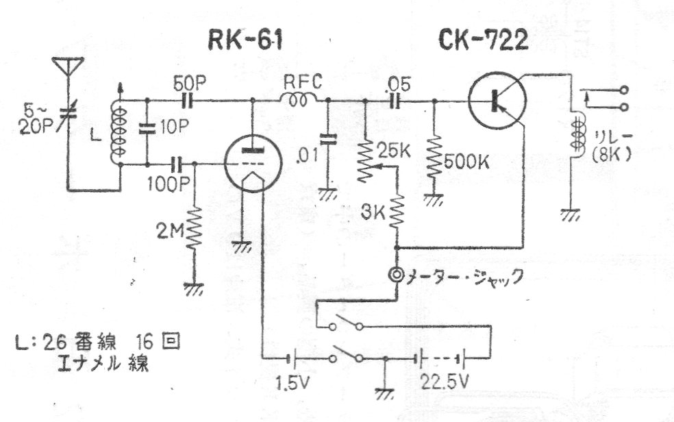 Este es el circuito receptor para el transmisor V7685S operando con una válvula y un transistor en el accionamiento de un relé. La bobina consiste en 16 espiras de hilo 26 y el circuito utiliza dos baterías, siendo una de baja y otra de alta tensión. El rango de operación es alrededor de 27 MHz.