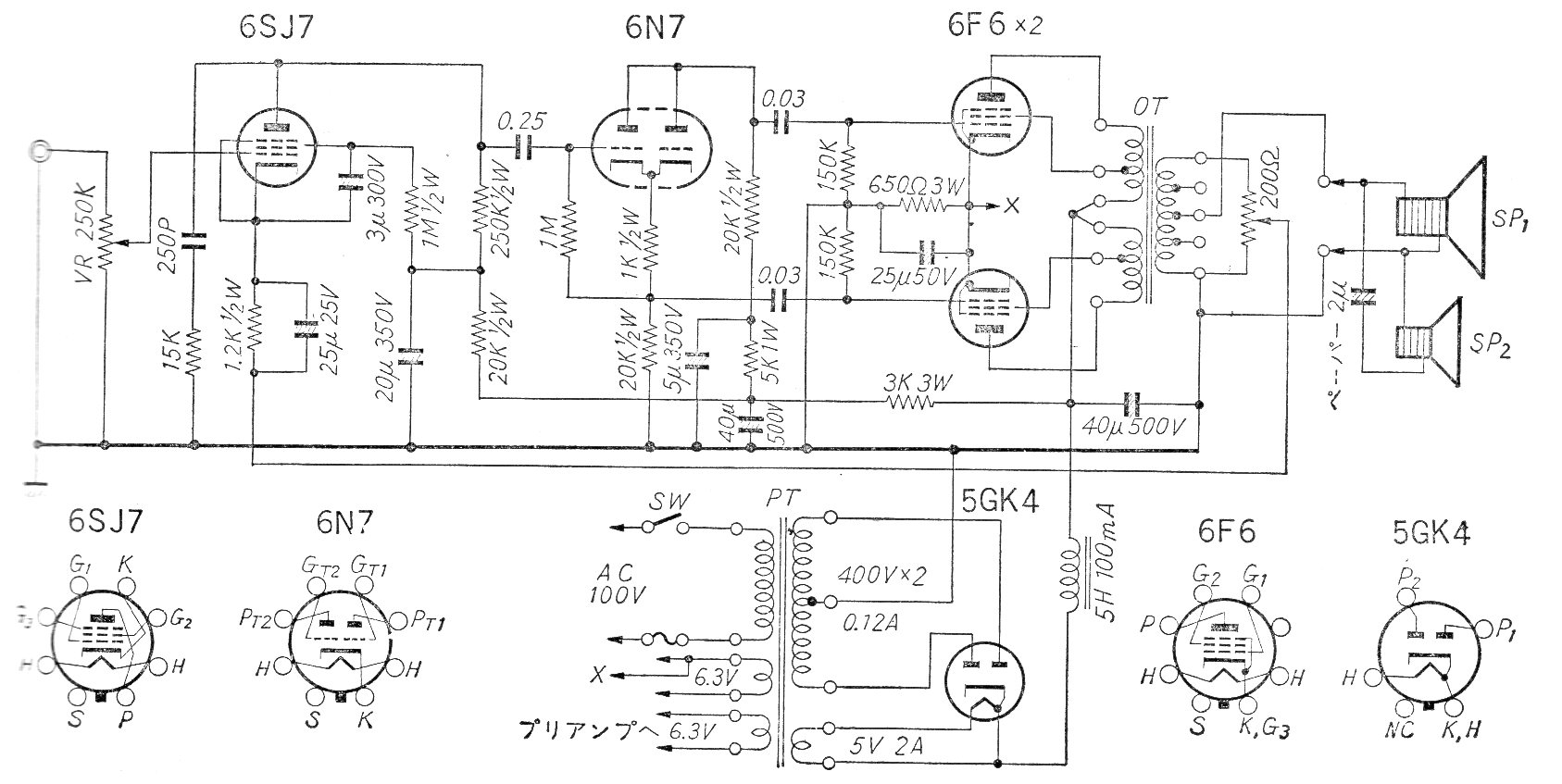Este circuito, con las válvulas pentodo de potencia 6F6, fue obtenido en una documentación técnica japonesa de los años 60. El circuito tiene salida en push-pull con transformador con diversas impedancias de salida e incluye el sector de fuente de alimentación con pinza de las válvulas utilizadas.