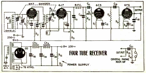 Encontrado en una publicación de 1942, este receptor se puede fabricar con válvulas equivalentes más modernas. El circuito tiene una salida de auriculares, pero su señal se puede aplicar a un transformador. Las bobinas son para el rango de onda media y el circuito tiene doble sintonía con una etapa amplificadora de RF.