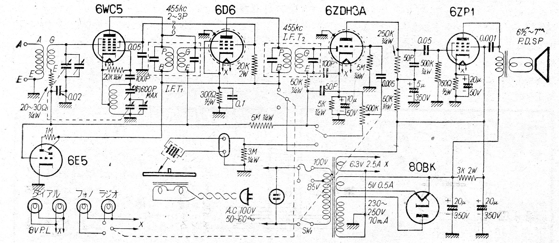 Este es el circuito de una radio con tocadiscos de mesa vendidos en Japón en los años 50. La radio con la banda de AM sólo tenía un tocadiscos con amplificador de algunos watts y buena calidad de sonido. Algunas válvulas usadas son poco comunes.