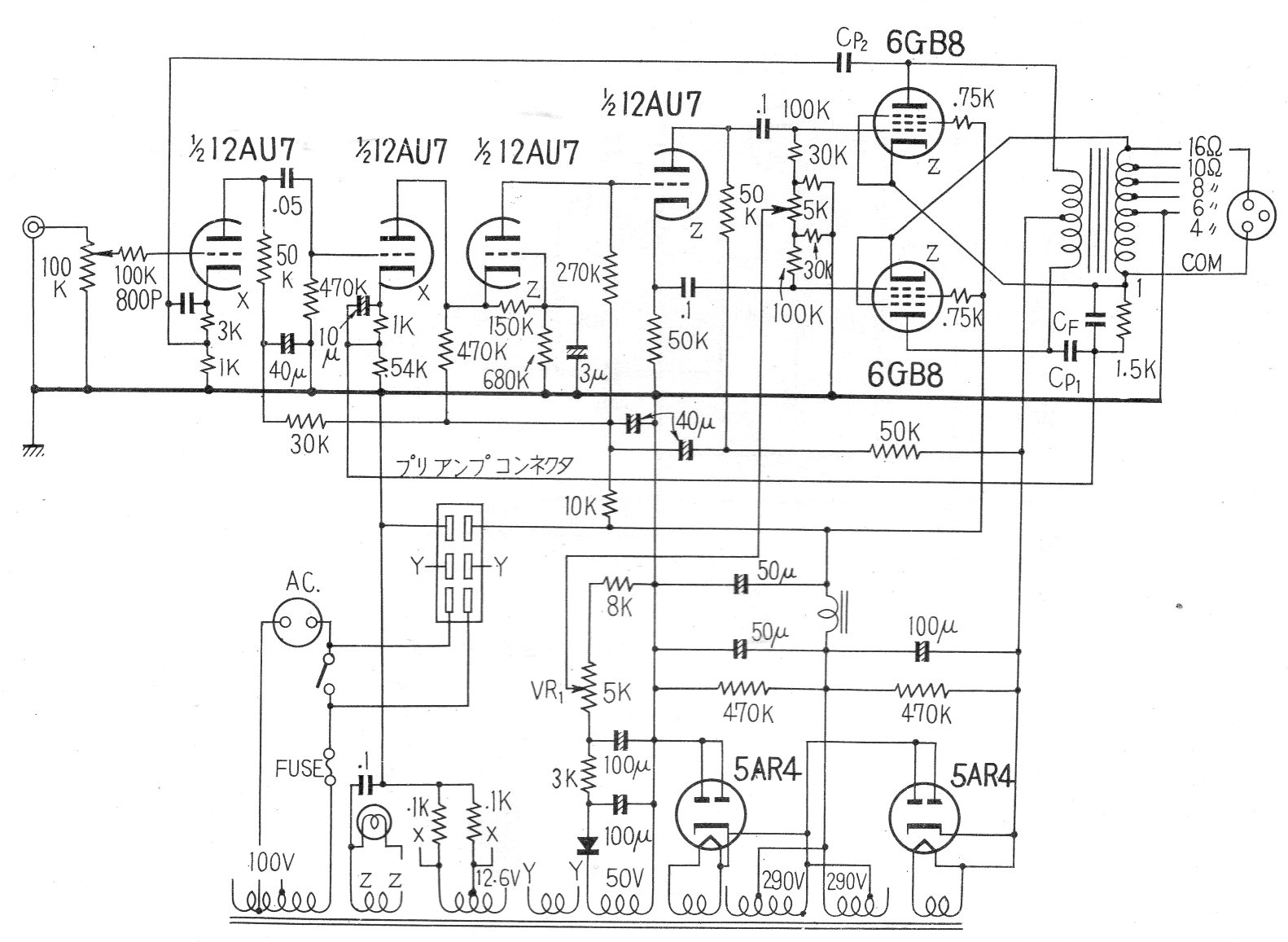 Este potente amplificador valvular fue encontrado en una revista japonesa de 1961. El circuito utiliza dos pentodos 6GB8 en push-pull para obtener los 70 W de salida de excelente sonido. El circuito incluye la fuente de alimentación con un transformador de varias tensiones.