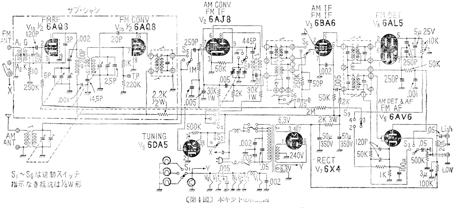Este circuito fue encontrado en una documentación japonesa de 1969. En él hemos representado un sintonizador de FM de la época, observándose que la banda de FM en Japón en la época era un poco diferente a la nuestra. La banda es de 76 a 90 MHz y se utiliza todavía hoy.