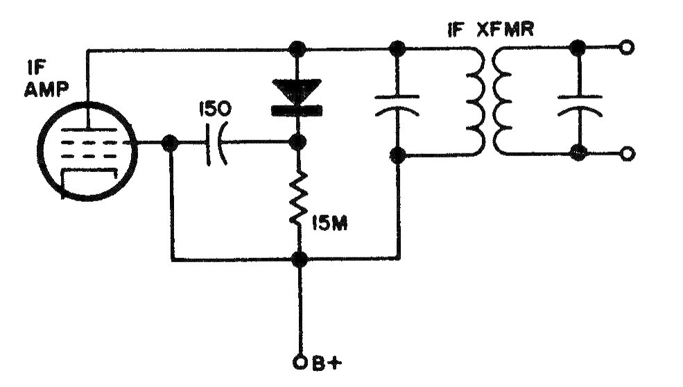 El propósito de este circuito es limitar los picos de ruido en un receptor de radio. El circuito es de una documentación de los años 80. El diodo se usa comúnmente y el circuito se aplica a una etapa IF del receptor.