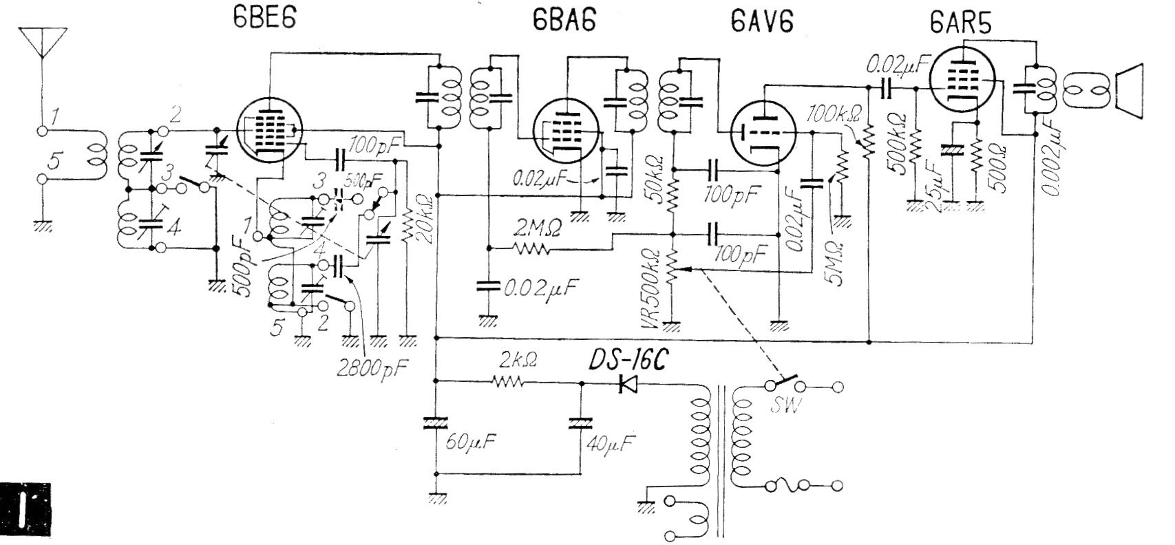 Este receptor de dos bandas de onda con configuración comercial de super-heterodino fue encontrado en una documentación japonesa de los años 60. El circuito tiene una llave simple de conmutación de pistas que pone en corto las bobinas de ondas medias para recibir las ondas cortas. El circuito incluye la fuente de alimentación.