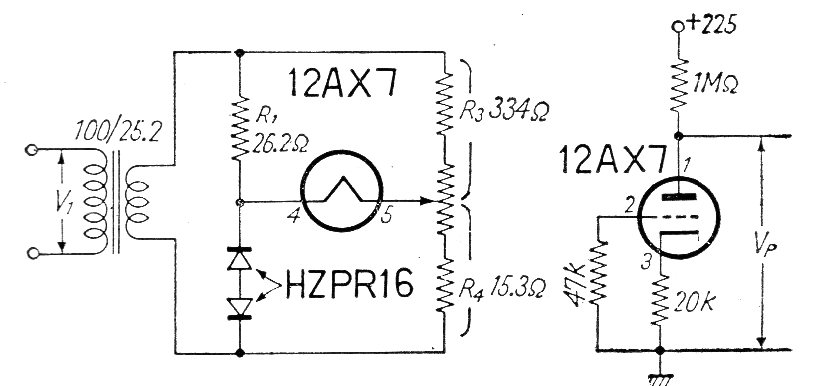 En los preamplificadores valvulados de muy alta ganancia, el filamento puede ser responsable de la emisión de roncos de 60 Hz. Se puede neutralizar este ronco con un circuito de alimentación balanceado, como se muestra en la figura. Este circuito fue obtenido en una documentación japonesa de los años 60. Los diodos son zeners de baja tensión.