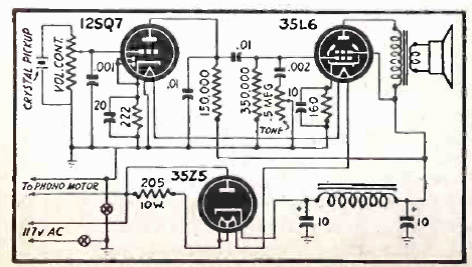 Este sencillo circuito de 3 válvulas es típico de la época. Lo encontramos en una publicación de 1945. La potencia ronda los 2 W usándose en tocadiscos portátiles de bajo coste. La energía proviene directamente de la red eléctrica.