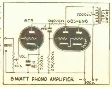 Este circuito se encontró en la documentación de 1943. La potencia de salida es de 5 W de un triodo de doble contrafase. El 6C5 funciona como preamplificador para un fonocaptor de alta impedancia.