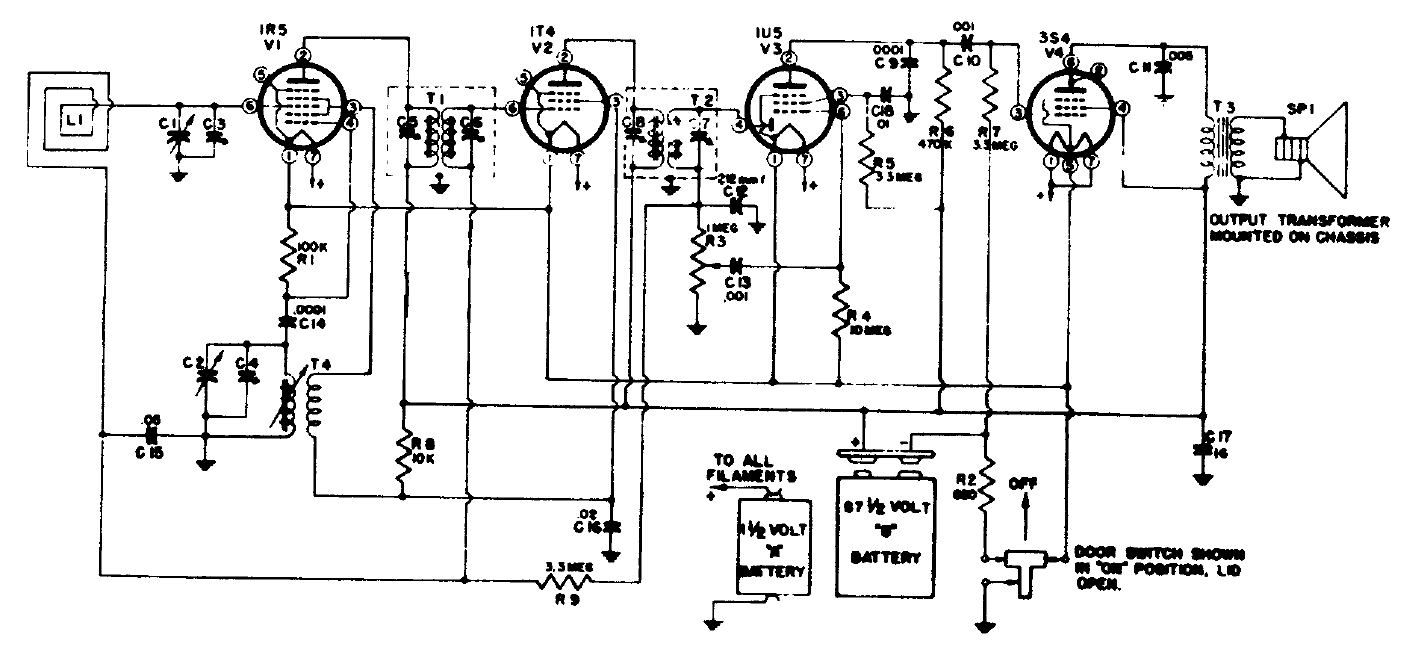 Este receptor de 4 válvulas portátil era alimentado por dos baterías, una de 1,5 V para los filamentos y otra de 67,5 V para el circuito de alta tensión. El receptor captaba las estaciones de onda medias con una antena de cuadro.