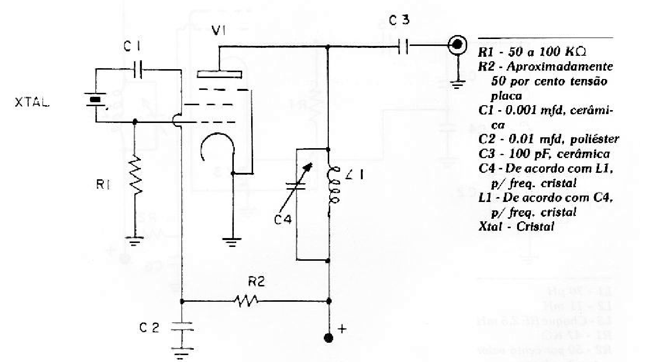 En la figura tenemos el circuito denominado Pierce-Colpitts, cuya característica principal es proporcionar una gran cantidad de armónicos, permitiendo que un cristal de frecuencia baja pueda generar, a la salida, frecuencias para operar en el 2 °, 3 °, 4 ° etc . armónicos: este circuito opera con cualquier tipo de cristal. Se debe notar, sin embargo, que si el cristal posee frecuencias espurias, las mismas también serán producidas a la salida.