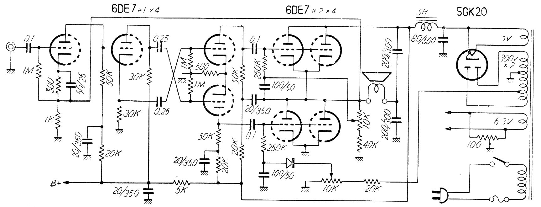 Este amplificador no utiliza transformadores en el paso de salida. Sólo se emplea el transformador de fuerza. La salida es de baja impedancia con una impedancia de 200 a 300 ohms. El circuito es de una documentación japonesa de los años 60. La válvula usada en la salida es la 6DE7.