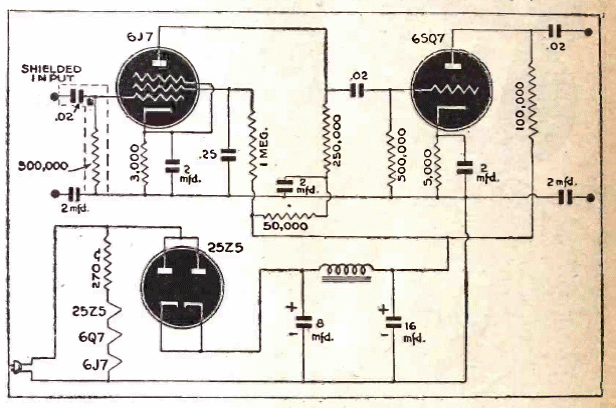 Encontrado en una publicación de 1944, este preamplificador se alimenta directamente de la red eléctrica y no necesita un transformador en la fuente. El circuito tiene una buena ganancia dada por la ganancia de la válvula (mu) y las resistencias de retroalimentación.