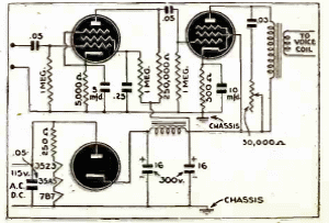Este circuito de tocadiscos se encontró en una publicación de 1943. El circuito usa solo 3 válvulas y está alimentado por la red eléctrica. La potencia debe estar alrededor de unos pocos watts.
