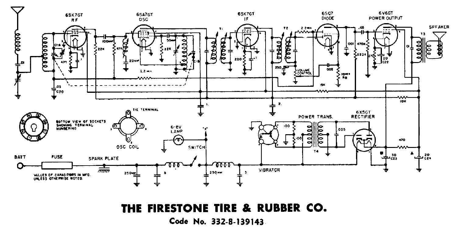 Si, en ese momento Firestone también fabricaba radios además de neumáticos. El receptor mostrado en la figura era para la banda de ondas medias y usaba 5 válvulas con FI de 455 kHz.