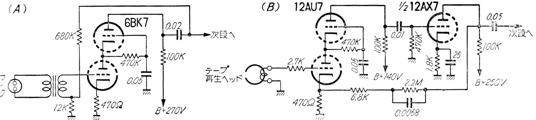 Estos dos circuitos de preamplificadores para cabezas magnéticas fueron obtenidos en una revista técnica japonesa de los años 60. El primer circuito utiliza un doble triodo y el segundo un doble triodo y la mitad de otro. La alimentación debe ser hecha con alta tensión obtenida del propio amplificador con los que deben funcionar.