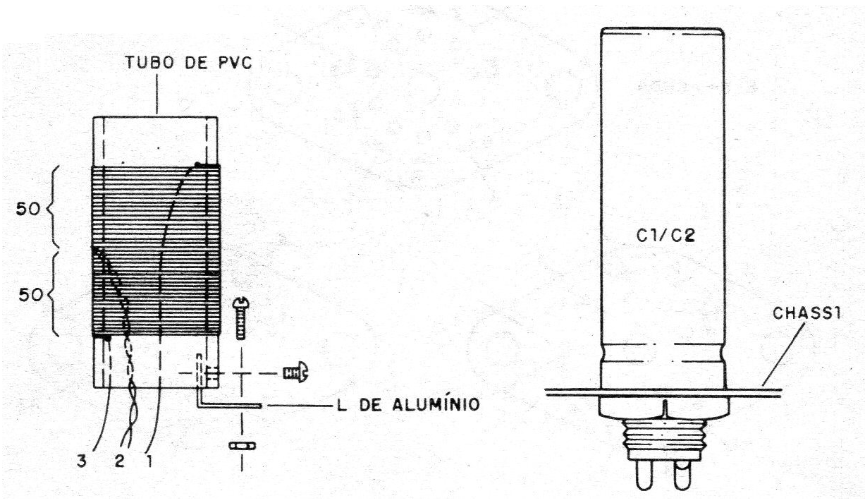 La bobina está formada por 50 + 50 vueltas de alambre esmaltado 26 o 28, que se envuelven en un mango de escoba o un trozo de tubo de PVC de 1 pulgada o aproximadamente eso (2 a 2,5 cm).