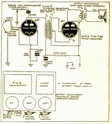 Esta interesante configuración de amplificador de doble triodo apareció en una publicación de 1942. El circuito no es el mejor, ya que las válvulas triodo no son adecuados para la amplificación de audio de potencia, pero es una solución alternativa sugerida por la publicación.