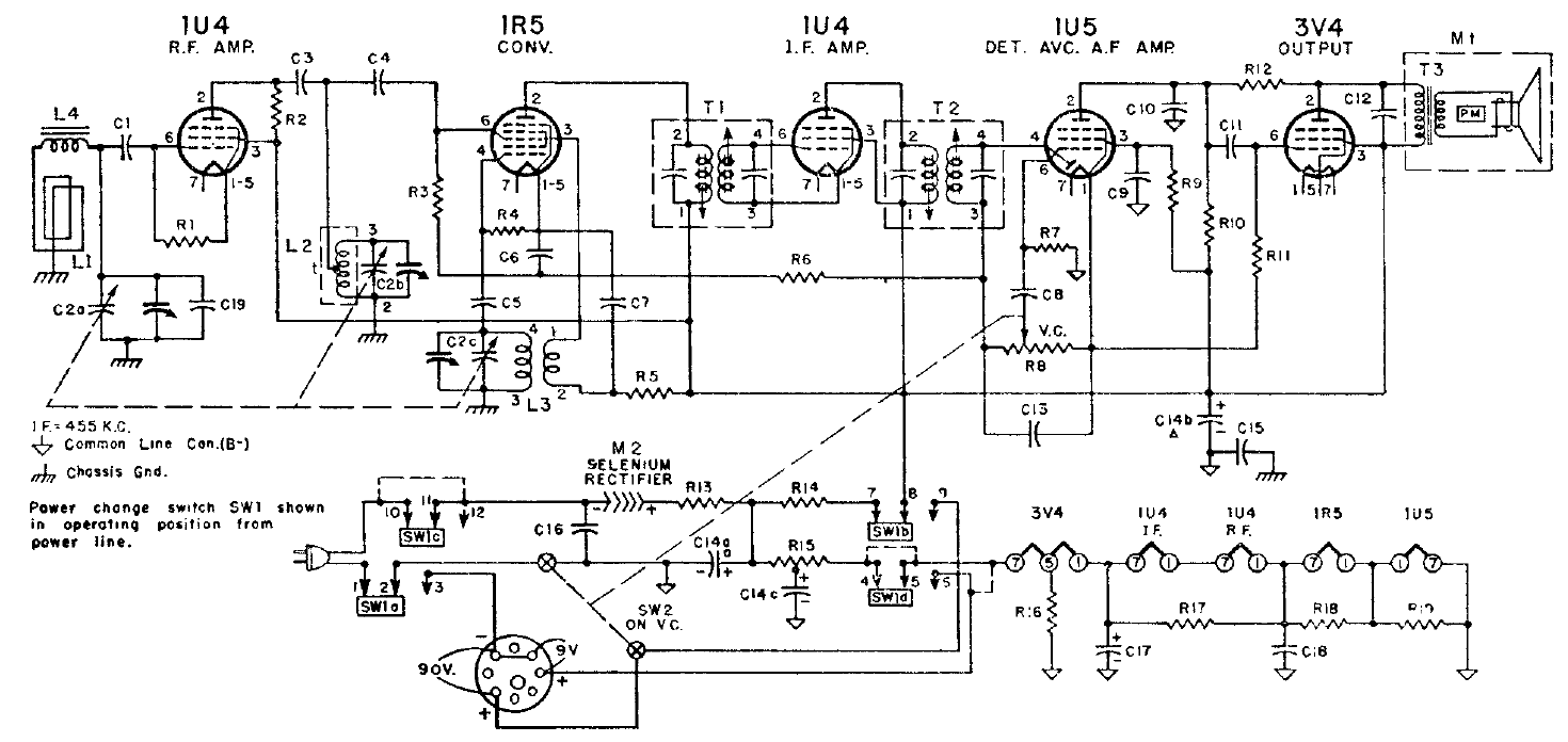 La baja tensión de los filamentos de las válvulas de esta radio de ondas medias posibilitaba su alimentación con batería. Se utilizaba una batería de 1,5 V para los filamentos y una batería de 90 V para el + B.