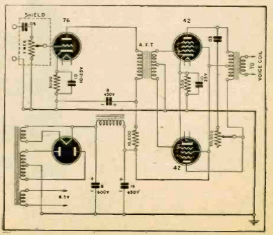 El amplificador que se muestra es de una documentación de 1944. Se utilizan 4 válvulas y la salida es de unos pocos watts. Las válvulas son tipos de la época. La fuente de alimentación está incluida.