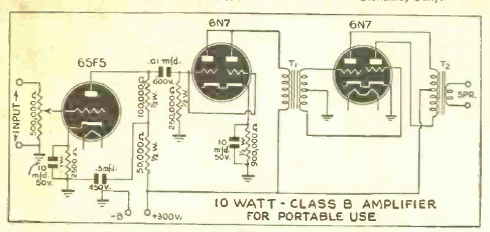 Encontrado en una publicación de 1943, este amplificador de clase B tiene un buen rendimiento. El circuito no incluye la fuente de alimentación y tiene una sola entrada.