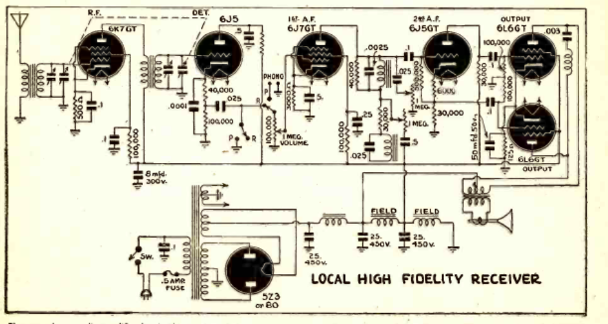 Indicado para estaciones locales en el rango de onda media, este circuito tiene dos etapas de RF con sintonía simultánea. El circuito es de una documentación de 1943 alimentado por la red eléctrica.