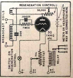 Este circuito de válvulas se encuentra en documentación de 1944. El circuito se alimenta con las tensiones indicadas. El relé es del tipo sensible a baja corriente y alta tensión.