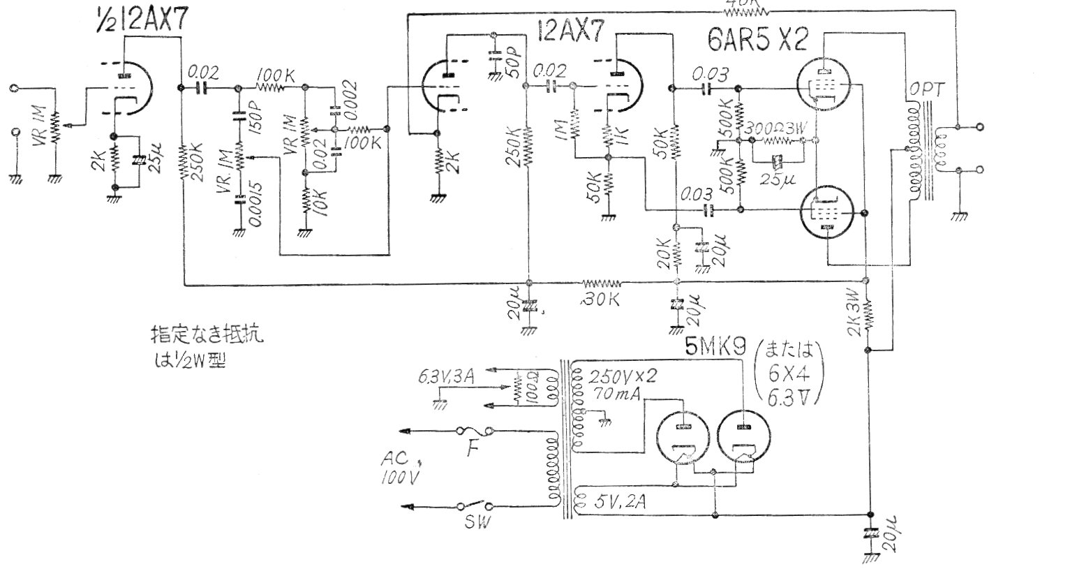Encontramos este buen amplificador con salida en push pull clase B en una publicación japonesa de los años 60. El circuito utiliza válvulas conocidas y se incluye el control de tono tipo Baxandall. La fuente de alimentación con dos válvulas rectificadoras está incluida en el circuito.