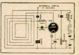 Este receptor de 1 válvula con antena de cuadro y escucha con auriculares se encontró en una publicación de 19444. Funciona con batería y el rango sintonizado es de onda media. Hay una opción para una antena externa.