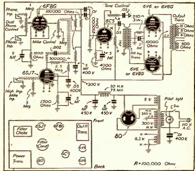 Este amplificador se encontró en una documentación de 1941. En la salida push-pull se utilizan válvulas 6V6, lo que garantiza una potencia de calidad. Evidentemente, los componentes críticos de este conjunto son las válvulas y los transformadores.