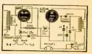 Este circuito de dos válvulas con la señal aplicada a los auriculares salió en Radio Craft en mayo de 1945. El circuito está alimentado por la red eléctrica y la válvula osciladora es un triodo. El transformador determina la frecuencia de funcionamiento.