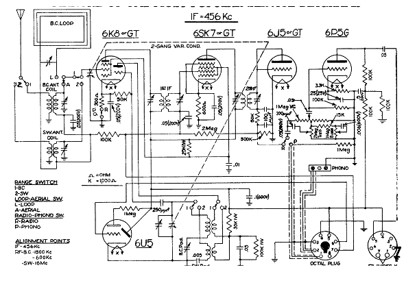 Este receptor de ondas medias con 5 válvulas presentaba excelente sensibilidad, tanto usando una antena de cuadro interna como externa.