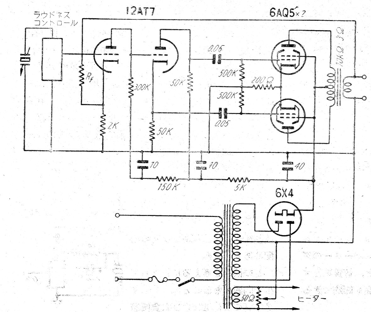 Este amplificador de algunos vatios de potencia con transformador lineal fue encontrado en una revista japonesa de los años 50. El circuito utiliza 4 válvulas, siendo una doble y tiene salida en contrafase con las válvulas 6AQ5, La fuente de alimentación se incluye con un potenciómetro de ajuste para tierra del filamento que reduce el ronquido.