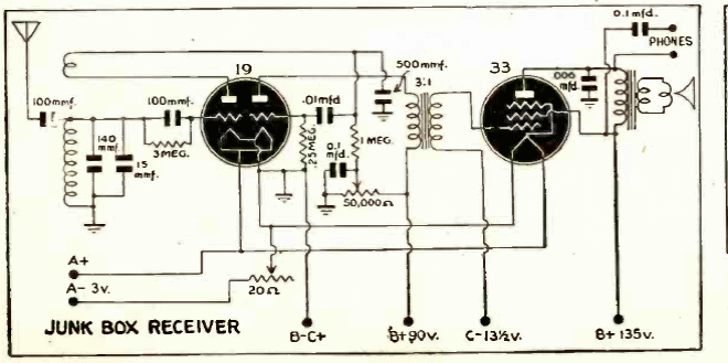 Con rendimiento de 3 tubos, este circuito para el rango de onda media se encontró en una publicación de 1943. No se proporciona la fuente de alimentación, pero se indican las tensiones.