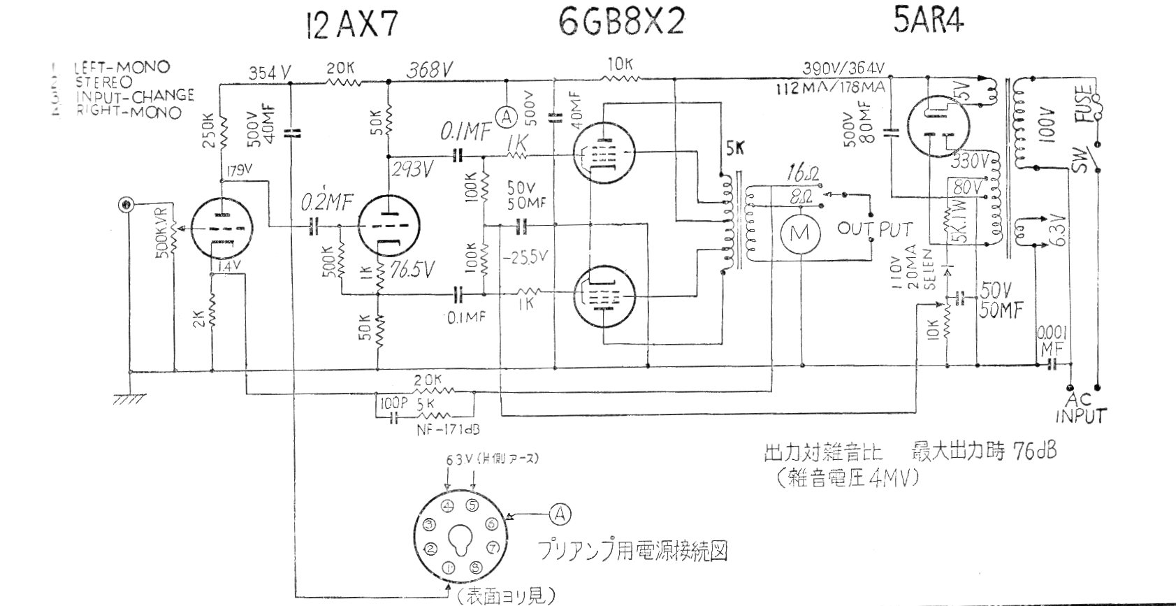 Este potente amplificador con las válvulas pentodo 6GB8 fue encontrado en una publicación japonesa de los años 60. El circuito incluye la fuente de alimentación y utiliza como excitadora y drive la conocida 12AX7.