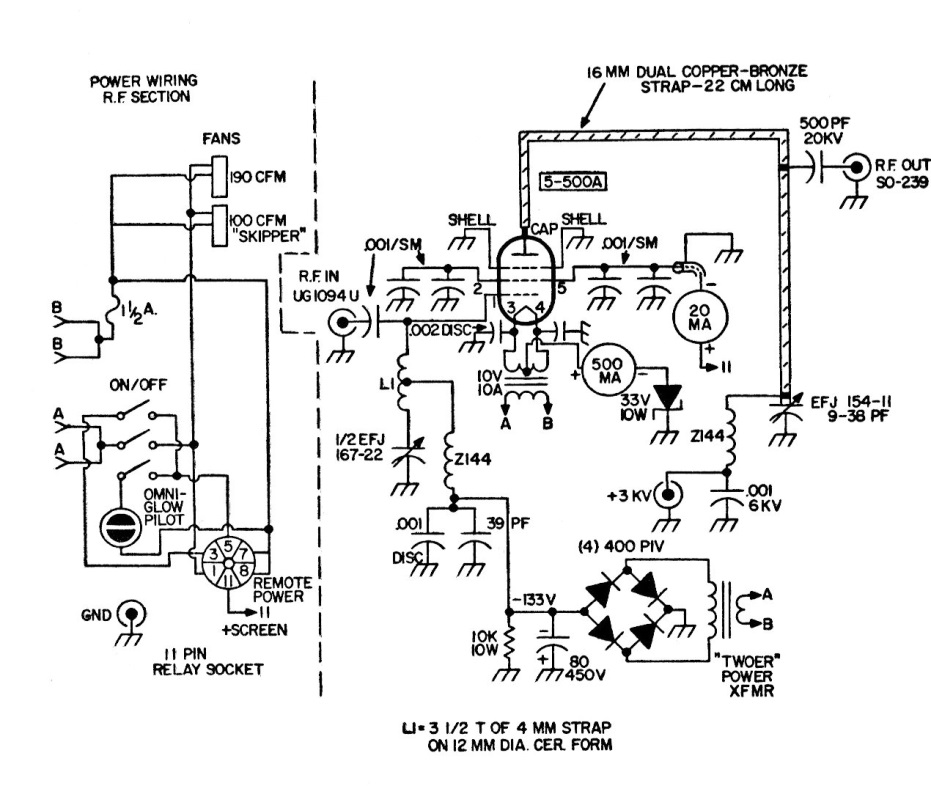 Este circuito de alta potencia para radioaficionados es de una documentación de los años 80. La alimentación es de 3000 V para el ánodo de la válvula, lo que requiere especial cuidado en la elaboración del montaje.