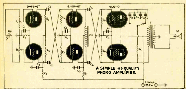 En la figura tenemos un esquema de amplificador para tocadiscos de 1943. El circuito usa 6 válvulas y no se le dio alimentación. Tenga en cuenta la salida push-pull y cómo se realiza la inversión de fase para excitar la etapa de salida.