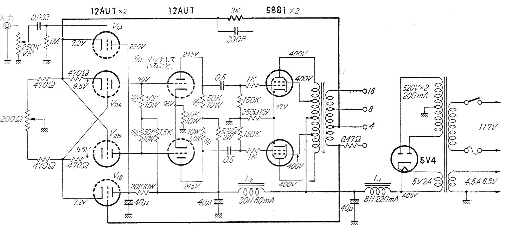 Este amplificador con las válvulas de potencia 5881 fue encontrado en una publicación japonesa de los años 60. El circuito incluye la fuente de alimentación y tiene una etapa de pre-amplificación e inversión de fase sofisticada. Los transformadores son los componentes críticos de este amplificador.