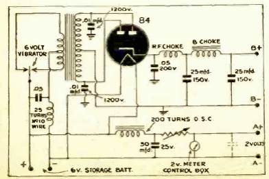 Este tipo de fuente se utilizó en las radios de los automóviles para generar alta tensión para la alimentación a partir de la batería de 12 V. Encontramos este circuito en una publicación de 1944.