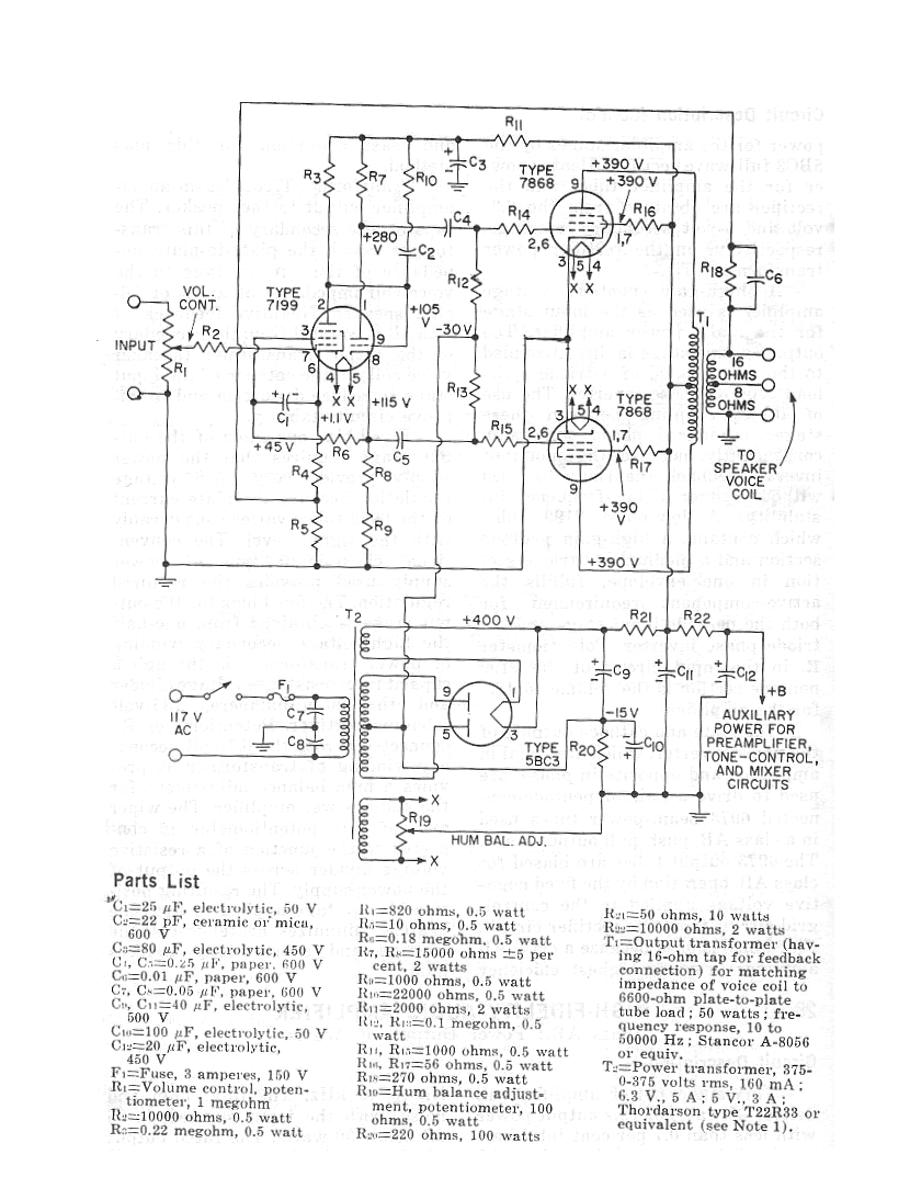 Este excelente amplificador de alta fidelidad se ha encontrado en el Manual de Válvulas de la RCA de 1971. Su potencia de salida es de 30 Wrms. Los componentes críticos de este proyecto son los transformadores que deben tener las características indicadas en la lista de material, mantenida como en el original en inglés. El circuito cuenta además con una salida para alimentación de un preamplificador o mezclador.
