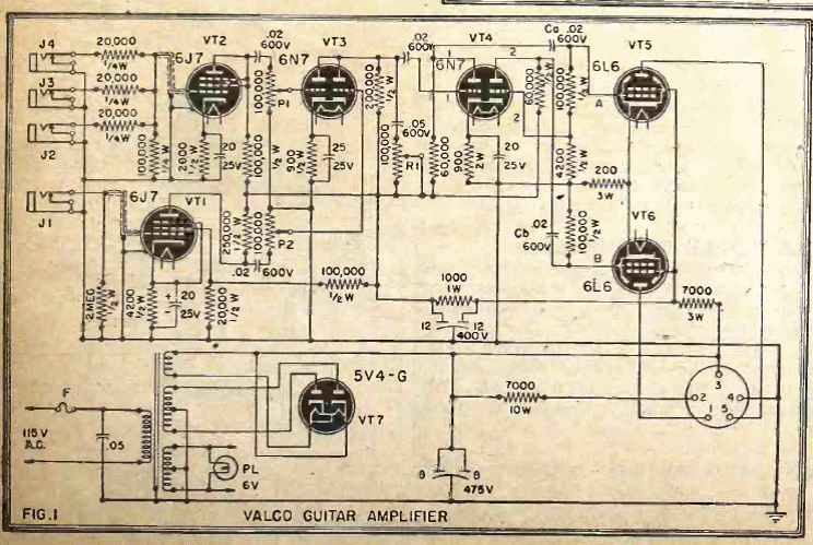 Este amplificador de guitarra se encontró en una documentación de 1943. Su salida es en contrafase y, como vemos, hay conectores para altavoces remotos. El circuito es alimentado directamente por una fuente conectada a la red eléctrica.