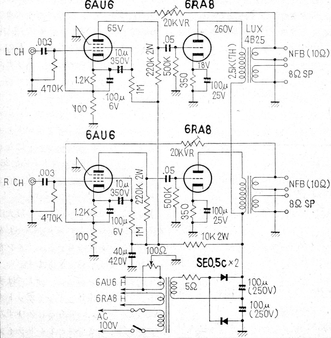 Este amplificador estéreo de algunos watts de potencia fue encontrado en una publicación japonesa de 1968. El circuito es bastante simple e incluye la fuente de alimentación ya con diodos semiconductores. El circuito no tiene control de volumen o tono que debe añadirse.