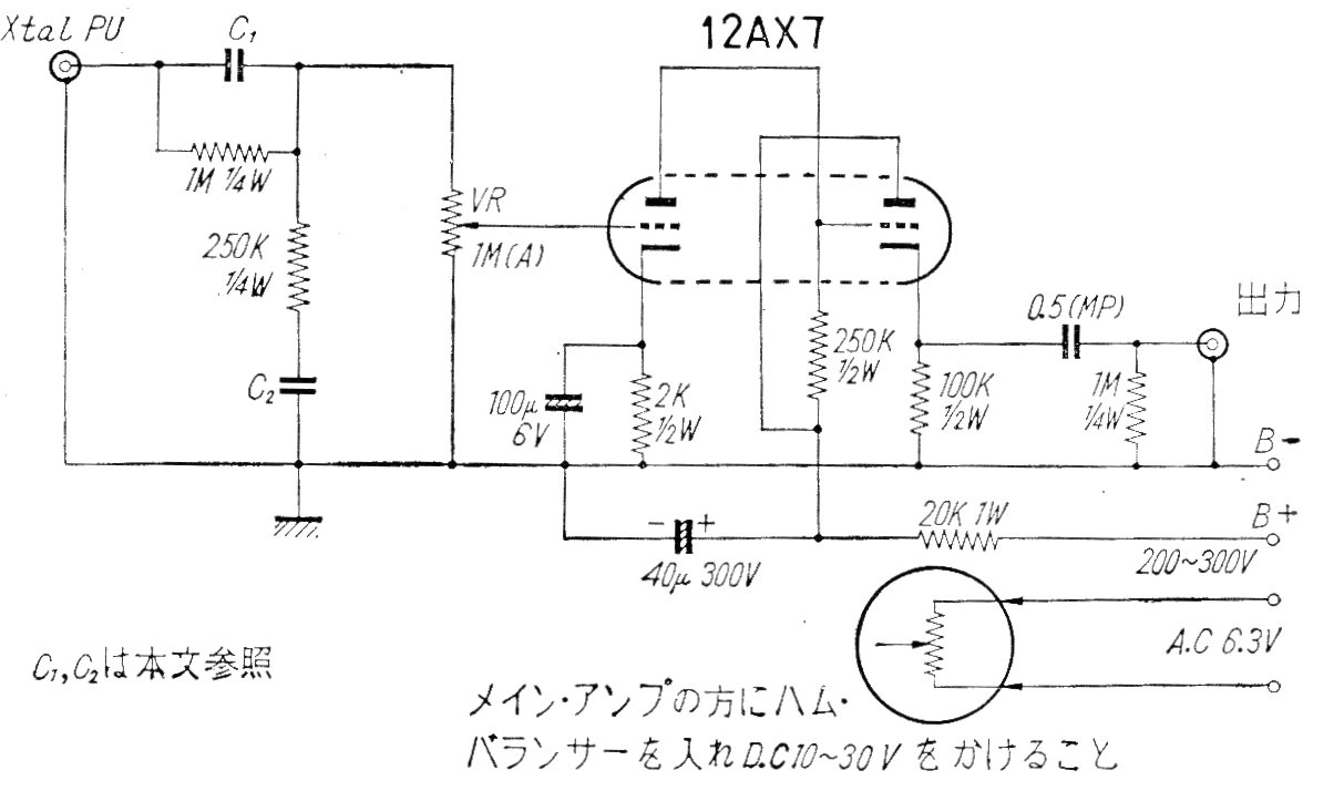 Esta etapa preamplificadora utilizando un doble triodo 12AX7 fue encontrada en una publicación japonesa de los años 60. El circuito no incluye de la fuente de alimentación de 200 a 300 V y tiene un potenciómetro de ajuste para la puesta a tierra del filamento de modo que se eviten roncos.