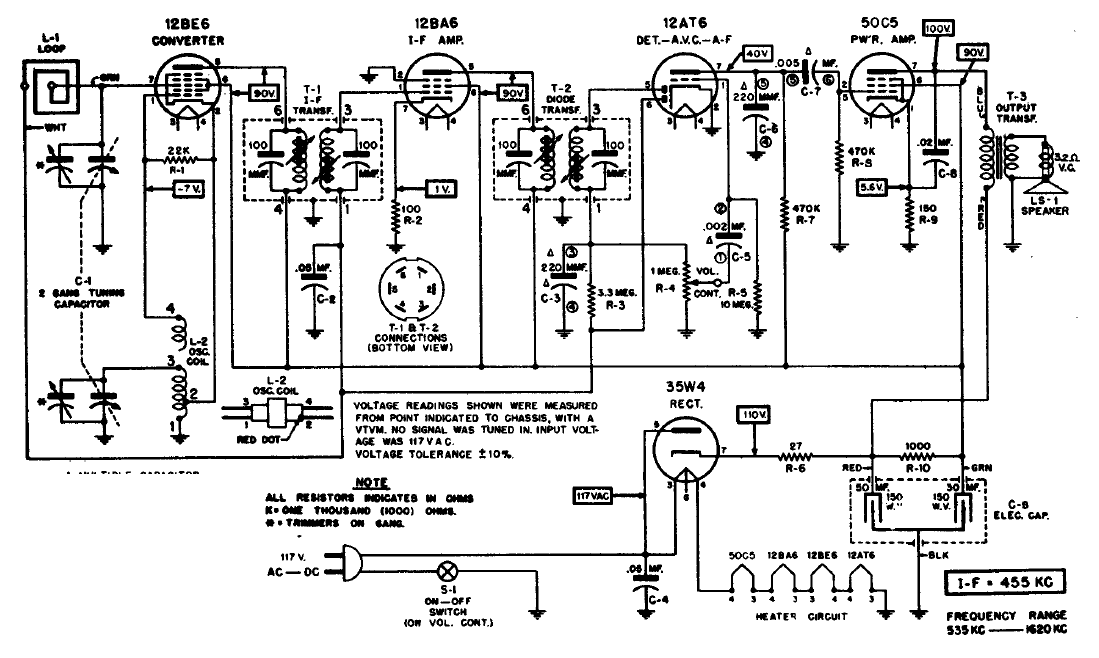 Esta radio AC DC de 5 válvulas tiene una configuración común, con FI de 455 kHz. Los filamentos de las válvulas se conectan en serie.
