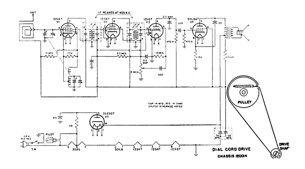 Este receptor simple de 5 válvulas de 1950 tenía antena de cuadro y FI de 455 kHz. Observe en el diagrama la indicación de cómo conectar la polea de la esfera y la variable.