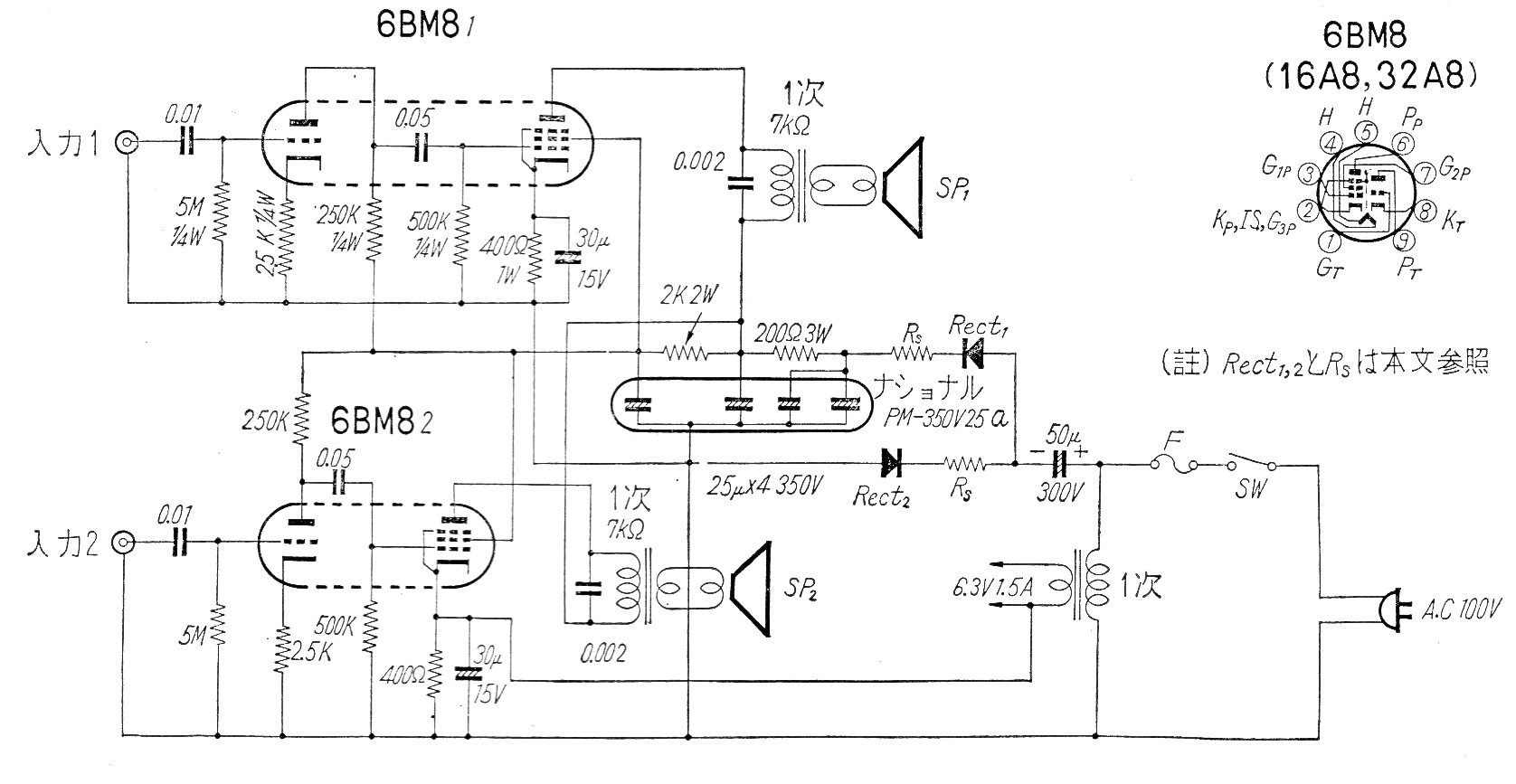 Este amplificador estéreo de pequeña potencia utiliza dos válvulas dobles. Fue encontrado en una documentación de los años 60 siendo indicado para tocadiscos portátiles de pequeña potencia. La alimentación es directa por la red de energía, sin el uso de transformador de alimentación. Diodos rectificadores se utilizaban en la fuente.