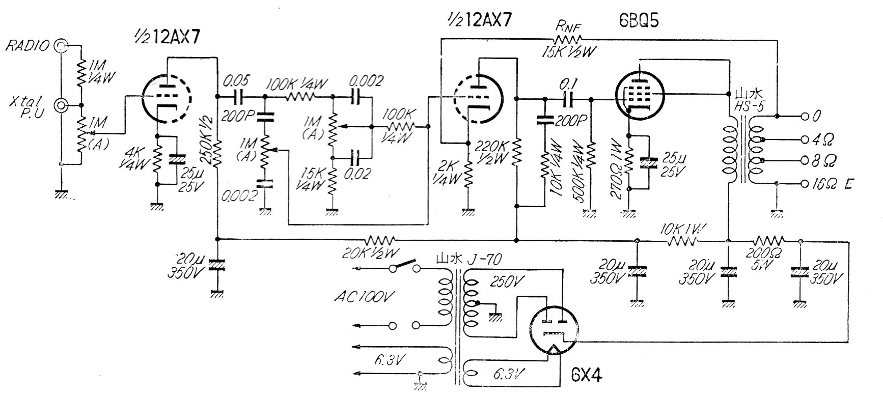 Este amplificador tiene una potencia de 1,95 W, según la publicación japonesa de los años 60 en que lo encontramos. Se trata de un circuito simple que se utilizaba en radios y tocadiscos económicos de la época. El circuito incluye la fuente de alimentación.