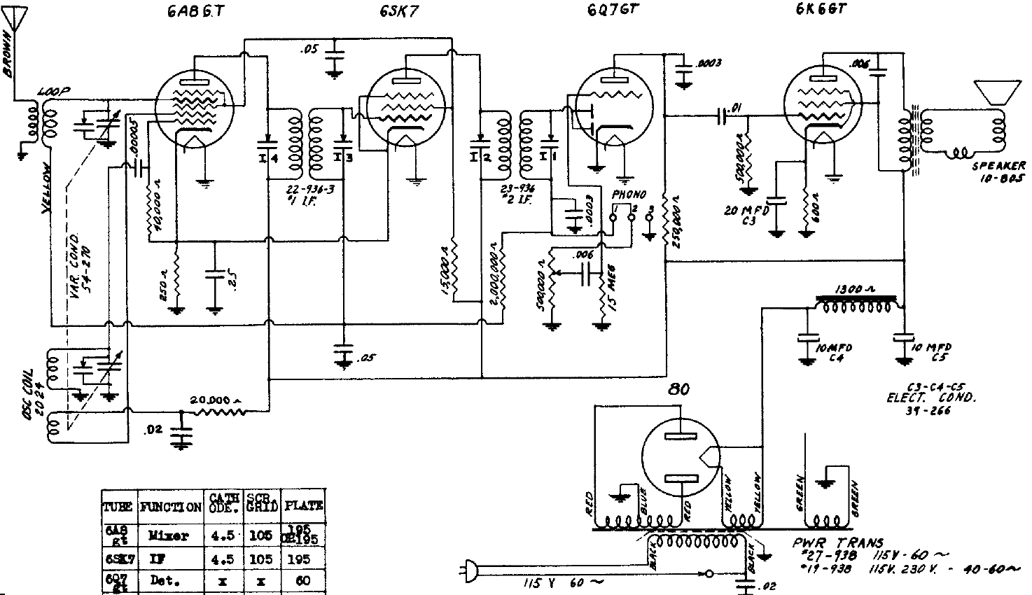 Este receptor de 1940 tiene una configuración común para la época, siendo el tipo más elaborado por el uso de un transformador de alimentación. El receptor es de 4 válvulas para el rango de ondas medias.