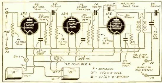 Este transmisor de 1941, que utiliza válvulas en miniatura y energía de batería, cabe en la palma de su mano. La frecuencia depende de las bobinas, indicando el rango de onda media entre 1500 y 1750 kHz. El circuito utiliza 3 válvulas y su alcance es del orden de algunas decenas de metros. La antena es una pieza de alambre estirado o se puede usar una antena externa más grande.