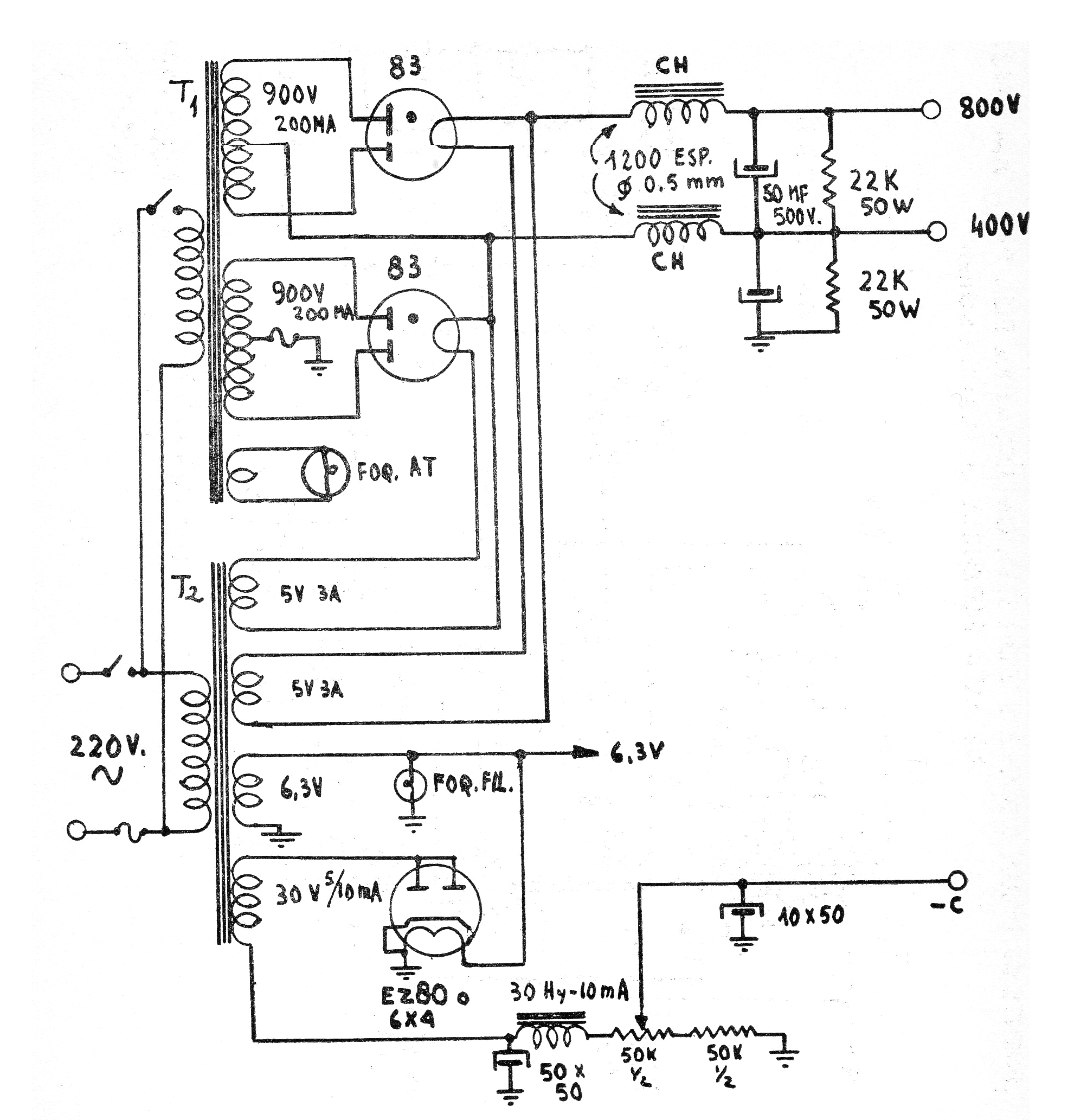 Esta fuente tradicional utilizada en equipos antiguos de Philips puede alimentar amplificadores de hasta 100 W. Los elementos críticos además de las válvulas son los transformadores y los golpes de filtro. Observe que los transformadores son de tensión bastante alta y que en la salida tenemos tensiones continuas de 400 V y 800 V. El segundo transformador se utiliza para alimentar más filamentos, normalmente del preamplificador y también proporcionar tensiones de polarización.