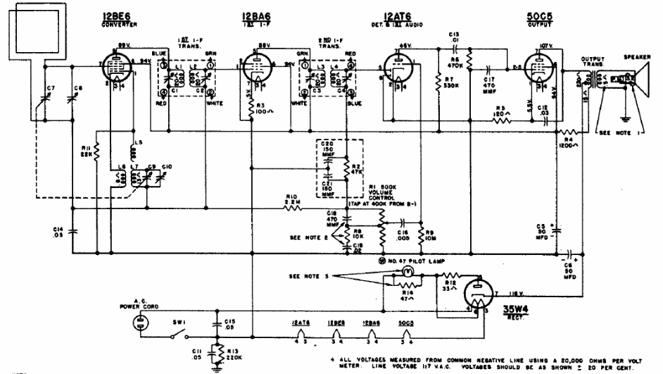 Este receptor de configuração comum usava antena de quadro e 5 válvulas com os filamentos ligados em série. O circuito se destinava a faixa de ondas médias.